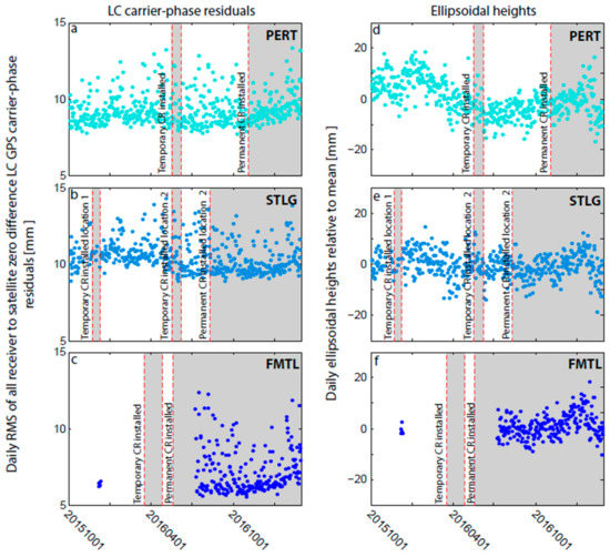 (a–c) Daily RMS of all receiver to satellite zero-difference ionosphere-free carrier-phase (LC) residuals (mm) calculated from static PPP processing using the NASA JPL GIPSY software (version 6.4). (d–f) Daily ellipsoidal height time series (mm) from the same PPP processing used for (a–c). Red lines and grey boxes indicate times when the accompanying corner reflector (CR) was temporarily/permanently deployed at each cGNSS site (Table 2).