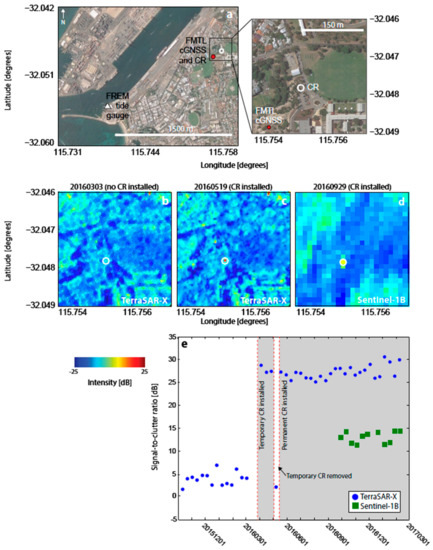 Corner reflector (CR) installation at John Curtin College of the Arts, ~1.5 km from the Fremantle tide gauge (labelled FMTL in Figure 1). (a) Google Earth view of the site showing the location of the tide gauge (white triangle), cGNSS (red dot) and CR location (white circle). Inset: enlarged view of the site showing the same area as (b–d). (b) TSX georeferenced backscatter intensity image prior to CR installation. (c) Same as for (b) but after CR installation. (d) Sentinel-1B georeferenced backscatter intensity image after CR installation. (e) Time series of signal-to-clutter ratio (SCR) at the location of the CR. Red lines and grey boxes indicate times when the CR was deployed.