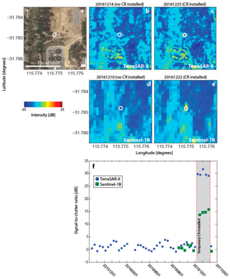 Prior to the test deployment period at Beenyup, the Sentinel-1B satellite began to acquire and release SAR imagery over Perth. Therefore, backscatter intensity imagery from both TSX and Sentinel-1B could be analysed simultaneously to select a location for the CR test installation. The CR was deployed for four overpasses of both satellites (Table 2). Like PERT, this site is characterised by few other man-made structures and low levels of background clutter (−12 dB for both TerraSAR-X and Sentinel-1B). Figure 7 shows that the CR is visible in intensity imagery for both missions with SCRs of ~31 dB for TSX and ~15 dB for Sentinel-1B.