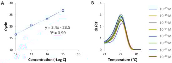 qPCR followed by HRM analysis, using the Mtd 3 sequence. (A) Calibration curve obtained by plotting the amount of cycles needed to reach the detection threshold in function of the concentrations (semi-log plot). Error bars represent one standard deviation (n = 2); (B) Melting analysis of the Mtd 3 target after 30 qPCR cycles at concentrations ranging from 1 pM to 1 fM.