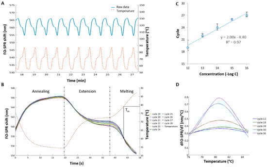 Quantification of celery Mtd 3 target using FO-PCR-MA. (A) Raw data of an FO-SPR PCR measurement. One measurement channel measures changes in refractive index due to the thermocycling. The FO-SPR signal is the inverse of the temperature measured with a thermocouple; (B) FO-SPR signal for 10 PCR cycles containing 100 fM celery DNA. Initially the FO-SPR signal is the exact inverse of the temperature signal; however, as the DNA concentration reaches the detection threshold of the FO-SPR biosensor, a melting point is visible around 44 s; (C) Calibration curve obtained by plotting the number of cycles, needed to reach the detection threshold, as a function of the target concentration (semi-log plot). Error bars represent the standard error on the last 5 melting peak signals of FO-PCR-MA cycles needed to reach the detection threshold (see Supplementary Information); (D) First order derivative of the FO-SPR signal to the temperature, which allows resolving the melting point of 100 fM target DNA (Mtd 3) amplified with the PCR on the FO-SPR device. Once the cycle-to-cycle amplification of the DNA target during the FO-PCR-MA reaction has reached the detection threshold of the FO-SPR sensor, the dSPR/dt signal increases every PCR round.