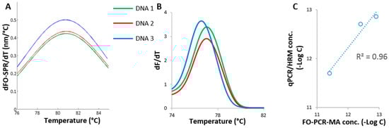 The developed FO-PCR-MA biosensor for the quantification of celery DNA was further benchmarked with qPCR/HRM using three cleaning water samples spiked with celery. These samples were prepared as mentioned in Section 2.5. Sample DNA 1 and DNA 2 were spiked with celery derived from stem tissue, while DNA 3 contained celery leaf tissue. The celery DNA concentrations were determined in these samples with FO-PCR-MA methodology (Figure 4A), using the calibration curve shown in Figure 3C and with the qPCR/HRM technology (Figure 4B), using the calibration curve shown in Figure 1A. The same FO-PCR-MA signal threshold of 0.095 nm was applied on the spiked celery samples as it was for the samples in the calibration curve (Figure S4, Supplementary Information). Based on the qPCR/HRM and the FO-PCR-MA, the Tm of the three samples was estimated at 76.9 ± 0.3 and 80.1 ± 0.5 °C, respectively (n = 3 for both analysis). The obtained values were in perfect accordance with the Tm determined in Figure 1B and Figure 3D, proving the correct identification of the amplified Mtd 3 target sequence in the cleaning water samples. As shown in Figure 4C, the celery concentrations quantified with the FO-PCR-MA biosensor correlated linearly with the corresponding qPCR/HRM results (R2 = 0.96). Moreover, the ICC was calculated to be 0.94 (n = 3).