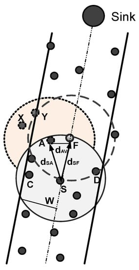 In location-aware vector-based forwarding (VBF), the forwarding area for transmission is confined within a virtual pipeline that is directional towards the destination. The virtual pipeline direction and radius remain constant from a source to a destination. In sparse networks, the unavailability of forwarder nodes due to the constant virtual pipeline radius causes retransmissions. Therefore, the VBF scheme does not perform well in sparse networks []. The performance of the VBF scheme is improved in the hop by hop VBF (HH-VBF) protocol by changing the direction of the virtual pipeline hop by hop. However, the unchanged pipeline radius restricts the network performance in the sparse node deployment because the probability of the void hole is not eliminated effectively. In the case of a small pipeline radius, the current forwarding node does not find potential forwarders in its effective transmission range. In other case, when the pipeline radius is large, packet duplication occurs due to the large number of forwarders in the pipeline []. This problem is further optimized in adaptive hop by hop vector-based forwarding (AHH-VBF). In [], the pipeline radius (PR) and transmission radius (TR) are adaptively changed hop by hop taking the neighbor node distribution into account. Moreover, the adaptive transmission radius is intended to avoid unwanted energy consumption. It is noteworthy that we have taken the motivation from the AHH-VBF scheme. In this paper, 2hop-AHH-VBF and QF-AHH-VBF adopt the adaptive PR and TR features of AHH-VBF; however, the proposed schemes are different in the following aspects.