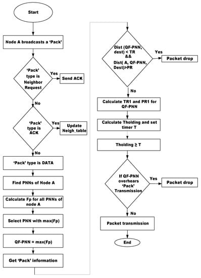 - In QF-AHH-VBF, every node computes the composite priority function () to elect itself as a qualified node. The node that secures high among the PNN of a sender node is assigned the lowest holding time. Eventually, network throughput and end-to-end delay are achieved opting for this mechanism.