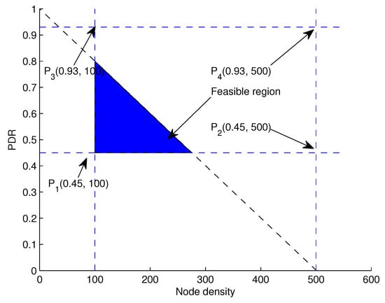 In Equation (19), the distance between a sender node and a receiving node should always be less than or equal to the transmission range of the sender node . Similarly, this distance must not be equal to zero, which is shown as  in Equation (20),