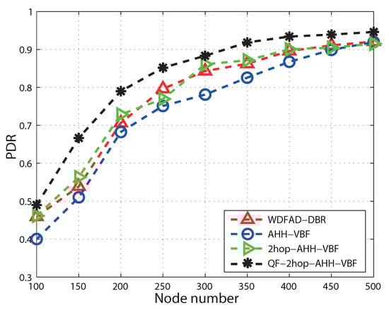 It can be seen in Figure 8 that as the node number increases, PDR begins to increase in all of the schemes. This is because the PNN per node increases as the node number increases. Hence, the void hole probability reduces due to the availability of qualified nodes in the ATD. PDR increases till a certain threshold; after that, collision at the receiver results in reduction of PDR. Below 300 nodes, 2hop-AHH-VBF and QF-2hop-AHH-VBF perform better than AHH-VBF due to the optimal forwarder selection in the ATD. This selection ensures successful packet transmission even in sparse regions in the network. As the node number increases beyond 300 nodes, the difference of PDR of all of the schemes reduces due to the fact that the increase in the node number itself reduces the void hole probability. However, QF-2hop-AHH-VBF outperforms AHH-VBF because of an optimal forwarder selection criterion in terms of node position and residual energy. Hence, QF-2hop-AHH-VBF performs better in sparse and dense environments. In dense network regions, duplication of packets is handled with the constrained pipeline radius as set by the AHH-VBF scheme. QF-2hop-AHH-VBF performs 5.6% better than AHH-VBF, while 2hop-AHHH-VBF and WDFAD-DBR perform slightly better than AHH-VBF in sparse regions. In dense regions, duplication of packets is avoided by opting for the mechanism to restrict the forwarding area in all four schemes. Hence, the performance pattern of all of the schemes is similar for a high number of nodes.