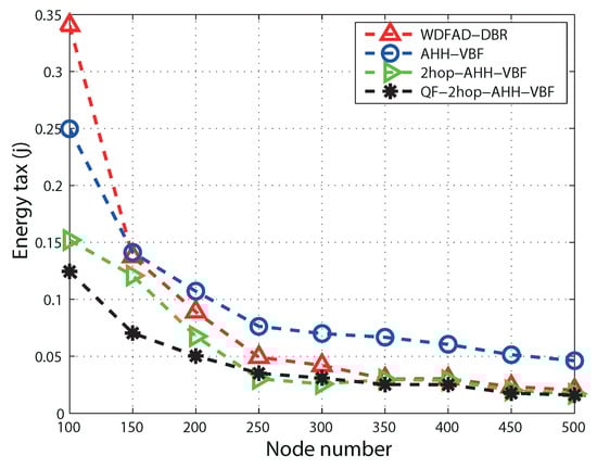 Energy tax tends to decrease with the increase in node number in all four schemes. This is due to the fact that the increase in node density increases the number of successful transmissions. In low node density regions, packet drop due to the unavailability of forwarding nodes results in more energy consumption. As in Figure 9, the AHH-VBF scheme takes more energy, while the node number is less. In the AHH-VBF scheme, information of the next hop forwarding node is not considered while transmitting the packet. Therefore, it leads to packet transmission towards the void region, and unnecessary energy tax is consumed due to transmission failure. It can be seen that the 2hop-AHH-VBF scheme consumes less energy than the AHH-VBF scheme because the unsuccessful transmissions are avoided here. While node number increases beyond 300, the difference of energy consumption reduces. QF-2hop-AHH-VBF performs better in terms of PDR; hence, it takes more energy consumption due to successful transmissions towards the destination. Moreover, the selection of the quality forwarder in QF-2hop-AHH-VBF is based on the two-hop information and the residual energy of forwarding nodes. Optimized selection of the qualified node for the forwarding process minimizes network overhead due to control packets. Hence, initially, the energy consumption of the QF-AHH-VBF scheme is high because of high PDR when compared with other routing schemes. Gradually, the energy tax difference is observed as the node number increases beyond 400. Similarly, QF-AHH-VBF outperforms WDFAD-DBR because the constrained pipeline radius avoids packet duplication, and qualified node selection based on the composite function provides the optimal path towards ATD. WDFAD-DBR decides the path on the basis of the weighting depth difference, which does not completely avoid packet duplication. Thus, WDFAD-DBR has unnecessary energy consumption.