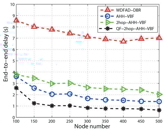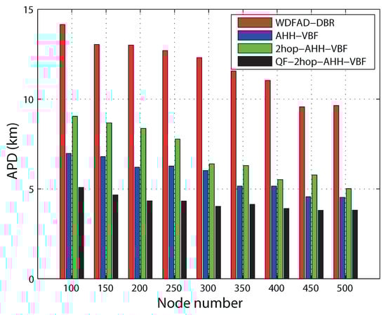 It can be observed in Figure 10 that all of the routing schemes follow the same decreasing trend in end-to-end delay. This is because in a sparse network, there are less potential neighbors. On the other hand, in a dense region, a node finds more potential neighbors, which is beneficial for the reduction of propagation delay. This eventually reduces end-to-end delay. End-to-end delay primarily comprises propagation delay, holding time, transmission delay and calculation time. Accumulated propagation distance increases while considering two hops for routing decision in 2hop-AHH-VBF. That is why 2hop-AHH-VBF bears more end-to-end delay as compared with AHH-VBF and WDFAD-DBR. Up to node Number 350, 2hop-AHH-VBF follows the same trend as AHH-VBF and WDFAD-DBR. After that as the node number increases, the number of hops taken to reach the destination also increases. Holding time for packets is also introduced in both schemes. Successful transmissions towards the destination cause transmission delay, which is also added to overall end-to-end calculations along with holding time. In AHH-VBF, qualified node selection criteria are based on the distance from the virtual vector. Without considering residual energy and two-hop information, this causes packets to forward towards the void region. Transmission failure increases end-to-end delay due to retransmissions of the same packet. Therefore, in the QF-2hop-AHH-VBF scheme, selection of the qualified node and holding time calculation are based on the composite function as in Equation (10). This reduces the propagation delay due to avoidance of the overage hole and efficiently minimizes holding time. Hence, QF-2hop-AHH-VBF performs 30% better than AHH-VBF scheme. Similarly, utilizing the two-hop information along with the node position with respect to the virtual vector results in less hop traversing in QF-2hop-AHH-VBF. Hence, it performs 28% more efficient in reducing APD as compared to the AHH-VBF scheme as shown in the Figure 11.