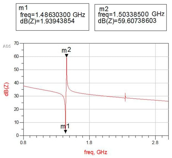 Combined with the central deflection of the diaphragm caused by internal stress of the support layer, the optimal thicknesses of the Si3N4 and SiO2 films are 0.7 μm and 0.5 μm respectively, in order to maximize the sensitivity and also retain minimized diaphragm deflection. The simulated impedance characteristic curve of the FBAR with optimal thickness of the support layer is shown in Figure 3. Series resonant frequency of the FBAR marked m1 is about 1.486 GHz and parallel resonant frequency marked m2 is about 1.503 GHz.