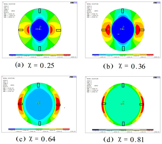 Figure 4. The strain distribution of the FBAR area with different coverage areas of sensing film under the same load: (a) χ = 0.25; (b) χ = 0.36; (c) χ = 0.64 (d) χ = 0.81.