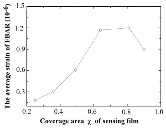 The average strain of the FBAR area with different coverages of sensing film under the same load are obtained and calculated using the same simulation method. The average strain curve of the FBAR under the same load is shown in Figure 5. The results show that the optimal coverage area χ of the sensing film for this vapor sensor is around 0.8.