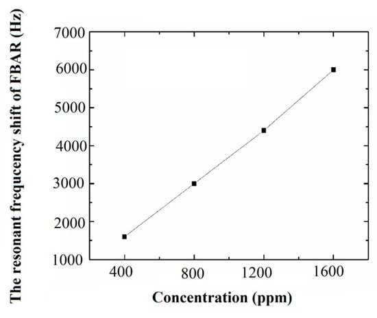 With the help of ADS software, the five-layer Mason equivalent circuit model of the FBAR is established to obtain the resonant frequency change of the FBAR with the varied longitudinal acoustic wave velocity v Z in the AlN film. The resonant frequency change curve of the sensor for chloroform under different vapor concentrations is obtained, as shown in Figure 7.