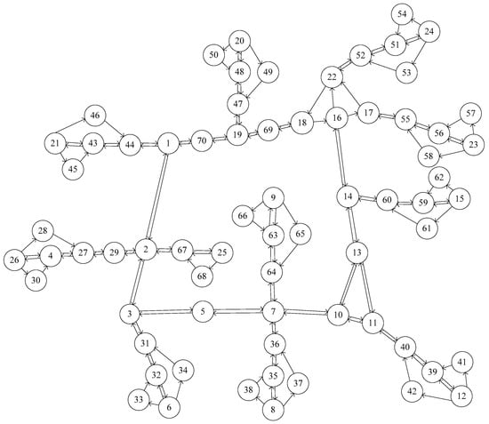 The most computationally demanding step in the aforementioned algorithm is calculating the inverse of (i.e., ). Interestingly, if we sequentially update one observed variable at a time in Equation (21), it avoids matrix inverse calculation, because is a column vector and is a scalar (i.e., ). In Step 2.5, if the total number of considered links and turning movements is and the number of identified sensor locations is c, the number of calculations needed is linearly correlated with the number of the remaining links and turning movements, which is the value of . As most of the computational efforts are related to Step 2.5, the computational time of solving the proposed NSLP model is linearly correlated with the number of links and turning movements considered in the network. In some cases, more than one sensor location may be identified by the proposed algorithm in Step 2.5 if these locations can provide the same covariance matrix reduction of the dynamic O-D demand estimates, which could entail additional computational efforts. The proposed algorithm is unable to determine which one of them should be included in the optimal sensor deployment and operation strategies. In this case, it needs to first identify all deployment and operation strategies with the same covariance matrix reduction of O-D demand estimates, and then choose the best one with the lowest variability.