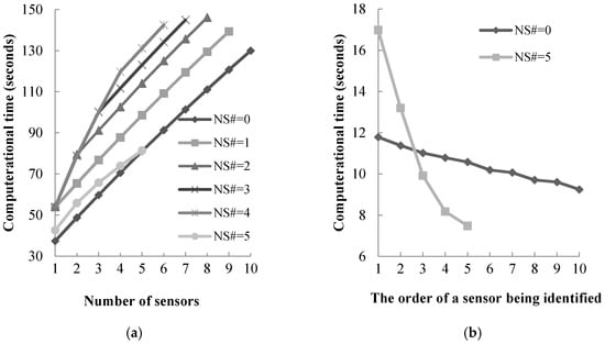 Figure 3a also shows that the computational time to identify a node sensor’s location is normally larger than that to identify a link sensor’s location, with NS# = 2, NS# = 3 and NS# = 4. This is because a node sensor can provide a greater amount of updated information compared to a link sensor, so more computational time is needed to update the information in Equations (30) and (31).
