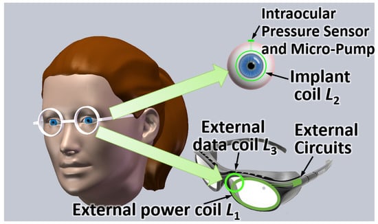 In this paper, to address the aforementioned problems, we propose a magnetic-balanced inductive link for our intraocular biomedical sensor device, as seen in Figure 1. The intraocular biomedical sensor device will be implanted in the patient’s eyeball to monitor and regulate the intraocular pressure (IOP) for glaucoma treatment, because lowering IOP is the only evidence-based treatment to prevent the deterioration of glaucoma [18,19]. The uplink sends out the data of the pressure for monitoring the IOP and the data of the peak voltage of the implant load for adaptive power adjustment. When the measured IOP is above the normal IOP, an actuator (micro-pump) is enabled to regulate the IOP. There are three coils (two external coils and one implant coil) used for the wireless power and data transmissions. The external power coil () is used for feeding the wireless power, and the external data coil () is used for the uplink data receiving, while the implant coil () is used for both the wireless power harvesting and the uplink data transmitting. Dual carriers (i.e., power carrier and uplink data carrier) are used for the power and uplink data transmissions, respectively. The two external coils are designed to be partially overlapped and magnetically balanced; thus, the power carrier interference to the uplink receiving can be minimized. The positions of the two external coils are carefully optimized based on the deduced formula of self-inductance and mutual inductance. We further optimize a key resistor of the inductive link circuits to minimize the impacts of the implant uplink transmitter on the WPT. The effects of coil misalignments are also evaluated. Finally, a prototype was implemented and measured. The magnetic-balanced inductive link achieves significant improvement of the SIR compared with the conventional two-coil inductive link. Benefiting from this substantial SIR improvement, the prototype achieves reliable uplink data and power transmissions under ultra-weak coupling with negligible interactions.