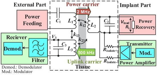 Implantable biomedical sensor systems will play an important role in future medical diagnoses and treatments [1,2]. The biomedical sensor systems tend to require simultaneous wireless power and data transmissions, as the large bulk of the battery always challenges the safety of the implants. The inductive link consisting of a magnetic-coupled coil pair is a viable method to transmit wireless power [3] and data [4]. However, the conventional two-coil inductive link could hardly meet all of the needs of future implantable biomedical sensor devices, as the future devices tend to be miniature and have a deep implantation, which will lead to ultra-weak coupling (typically ) between the coils. The ultra-weak coupling challenges the conventional inductive link in achieving reliable data transmission under the strong power interference, especially for the uplink (which is transmitted from the external part to the implant part) due to its low transmitted power. Rejecting the power interference and enhancing the uplink signal intensity are key issues when designing the inductive link for the small-sized biomedical sensor devices.