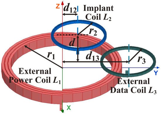 In this section, we optimize the distance () between the two external coils to improve the SIR. We select proper skew distance of the implant coil to avoid the substantial decrease of when the coil separation (d) is small. In addition, we optimize the turn number () of the external data coil to further improve the SIR. In order to guide the optimizations of the coil parameters, the formulas of mutual inductance, self-inductance and coupling coefficient are derived in Appendix A.