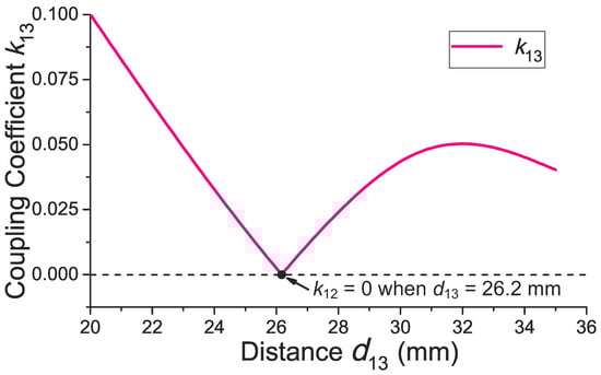When the distance () between the external power coil and the external data coil changes, the magnetic flux through the external data coil could be zero at a specific point because of the balanced inside and outside magnetic flux. Thus, the coupling coefficient () between the external power coil and the external data coil could be minimized to approach zero at an optimal . Figure 5 shows the calculated versus different based on Equation (A17). As seen, there is an optimal mm where equals zero. It is known that the direction of the magnetic field, which comes from the inside of the external power coil, is opposite the direction of the magnetic field that comes from the outside of the external power coil. When mm, the magnetic field in the data coil is balanced; the flux from the coil inside magnetic field is equal to the flux from the coil outside magnetic field. Thus, the total flux inside the data coil tends to be zero on this occasion, and the coupling between the coils approaches zero.