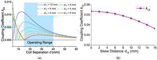 (a) Calculated coupling coefficient as a function of d versus different ; (b) calculated coupling coefficient versus different when the coil separation d is 20 mm.