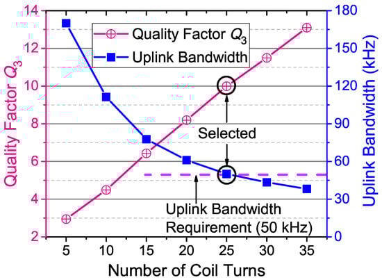 We manufactured a set of external data coils with different numbers of turns. Figure 7 shows the measured quality factor and its bandwidth. The quality factors are measured by using a network analyzer (E5071, Keysignt, Santa Rosa, CA, USA) at the uplink carrier frequency ( kHz). It can be seen that more turns of the coil contributes to higher quality factor. The bandwidth requirement for our intraocular sensor system is kHz to achieve the maximum 50 kbps data rate. Thus, the specified target for the external data coil is . To derive the target , the number of turns is selected to be 25 according to Figure 7.