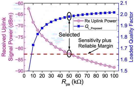 Figure 8 shows the calculated loaded quality factor and the Pspice simulated received uplink signal power versus at the maximum coil separation (d = 40 mm) in our operating range. It shows that higher resistance of leads to a higher loaded quality factor, but lower received uplink signal power. Figure 8 also shows the uplink receiver sensitivity, which is the minimal required signal power to ensure reliable receiving. The sensitivity is defined in Equation (12), where noise is the thermal noise floor (−174 dBm/Hz); BW is the bandwidth (50 kHz); SNR is the required signal-to-noise ratio (11.5 dB for error probability of BPSK demodulation); NF is the noise figure (about 11 dB in our prototype); Loss is the implementation loss (about 12 dB in our prototype). Thus, the sensitivity of our uplink receiver is dBm. The minimum uplink received power required is set to be −82.5 dBm, including a 10-dB reliable margin. When the coil separation is maximal (40 mm), the received uplink signal power is minimal. If the minimal power of received uplink signal in the operating range is higher than the receiver sensitivity, it can be ensured that the uplink is reliable in the entire operating range. As Figure 8 shows, when is larger than 50 k, the minimal received uplink signal power will be lower than the sensitivity plus the reliable margin. Therefore, is selected to be 50 k to achieve a higher loaded quality factor while at the same time fulfilling the constraint of the receiver sensitivity.