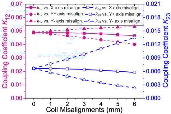 Calculated coupling coefficient and versus three different misalignments of the implant coil (‘Y+’ in the notation means misalignments in the positive direction of the Y axis, and ‘Y−’ means in the negative direction. The directions of the X axis and the Y axis are illustrated in Figure 3).