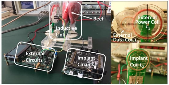 We implemented our prototype using discrete components and off-the-shelf chips to prove the feasibility of the future integrated circuit (IC) design, as shown in Figure 10. The coils and the inductive link circuit in the prototype are the same as those we optimized in Section 4 and Section 5. The power feeding circuit is implemented by a class-E power amplifier. The external receiving filter is implemented by a four-stage Butterworth low-pass filter. The external BPSK demodulator is digitally implemented in an MCU (STM32F207, STMicroelectronics, Geneva, Switzerland). The implant uplink power amplifier is merged in an H-bridge modulator to achieve low cost and high efficiency [24]. The implant BPSK modulator is implemented in an FPGA (Cyclone IV, Altera, San Jose, CA, USA).