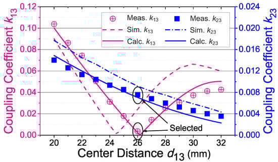 Measured (Meas.), simulated (Sim.) and calculated (Calc.) coupling coefficients (, ) versus the center distance (), when the coil separation is mm.
