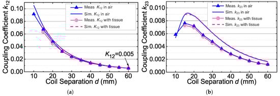 (a) Measured and simulated coupling coefficient versus the coil separation d in air and in tissue; (b) measured and simulated coupling coefficient versus the coil separation d in air and in tissue.