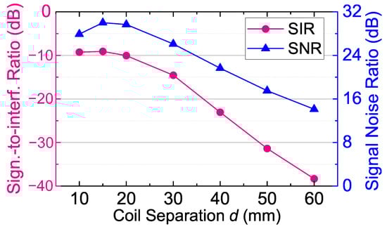 Since the external receiver acquires the uplink signal from the coil , the 500-kHz frequency component () of is the received uplink signal, and the 2-MHz frequency component () of is the power carrier interference. and are the angular frequencies of the uplink carrier and the power carrier, respectively. The SIR can be calculated as shown in Equation (7). Equation (7) could be fully expanded by using the symbolic solution of . However, the full expansion of Equation (7) is omitted, as the fully expansion results in a long and tedious expression.