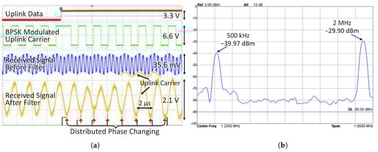 (a) The uplink waves captured from the prototype when the coil separation d = 20 mm; (b) the spectrum of the received uplink signal before the uplink receiving filter.