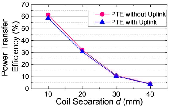 The power transfer efficiency versus coil separation d with or without connecting the uplink circuits, which includes the isolation resistors and the uplink transmitter. PTE, power transfer efficiency.