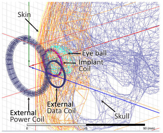 In order to assess the impacts of tissue on the inductive link, the implant coil is wrapped in 10 mm-thick beef tissue as seen in Figure 10. According to the work in [27], the permittivity and the conductivity of the beef muscle tissue are close to those of the human muscle tissue when the frequency is in the level of MHz. However, the tissues in the eyeball need to be further studied, because our implant coil is designed to be implanted around the eyeball. Thus, we further place the inductive link in the specific true-CAD human head model and simulate them in the ANSYS HFSS electromagnetic simulation suite as seen in Figure 16. There are tissues of skin, fat, muscle, eyeball and skull in the human head model. The true-CAD human head model is obtained from NEVA Electromagnetics [28]. The permittivity and the conductivity of the tissues are obtained from [29]. In the simulation, the implant coil is wrapped in silica gel and surrounds the periphery of the cornea hidden behind the eyelid.