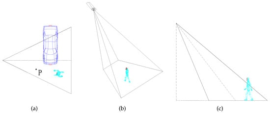 (a) There are three different types of targets (a point P, a car and a person) in the sensing area of the camera sensor. Obviously, it is not appropriate to use points to express different targets. Furthermore, the camera sensor cannot capture the license plate number of a car because of the camera sensor’s viewing direction; (b) A person is seemingly captured by the camera sensor when he is walking in the sensing area of the camera sensor; (c) However, the camera sensor cannot recognize the walking person because the person’s face is not in the sensing area of the camera sensor.
