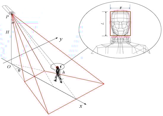 The person continues to move to , the effective vertical angle is (). When the person continues to move forward, the effective vertical angle will be larger. However, we can easily prove that the resolution of ROI captured by camera sensors will decrease (see Equation (9)).