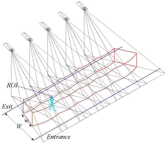 We consider a regular pattern [] in which all camera sensors are deployed on a line along the exit and all camera sensors face toward the entrance, and the width between the entrance and the exit is W. All camera sensors have the same height and the distance of every two adjacent camera sensors is equivalent. For this deployment pattern, we can achieve a 3D barrier space with width w that needs to be monitored. As a result, we obtain the barrier coverage as shown by the ’red space’ in Figure 4. Figure 5a,b are the vertical view of barrier coverage and the lateral view of barrier coverage, respectively.