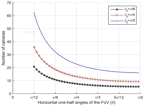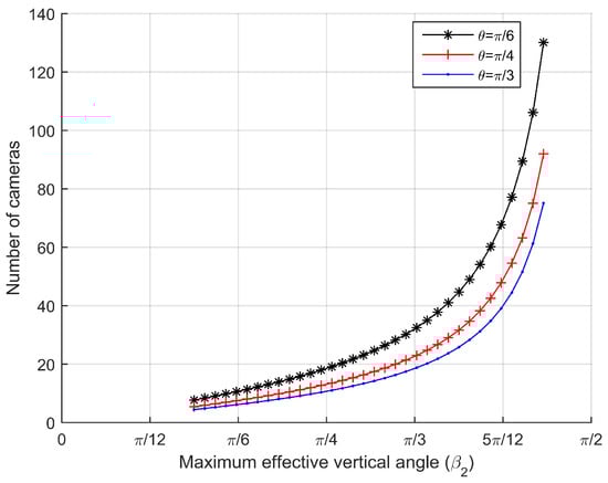 Next we evaluate the number of camera sensors per 100 m needed for coverage with respect to the maximum effective vertical angle given the horizontal one-half angles of FoV , and . By comparing the three curves in Figure 8, it can be seen that as the maximum effective vertical angle becomes larger, the number of camera sensors needed is also increased. However, since the existing of the effective vertical angle cannot be 0, the number of camera sensors will obtain the minimum value when the maximum effective vertical angle approaches to the minimum effective vertical angle .