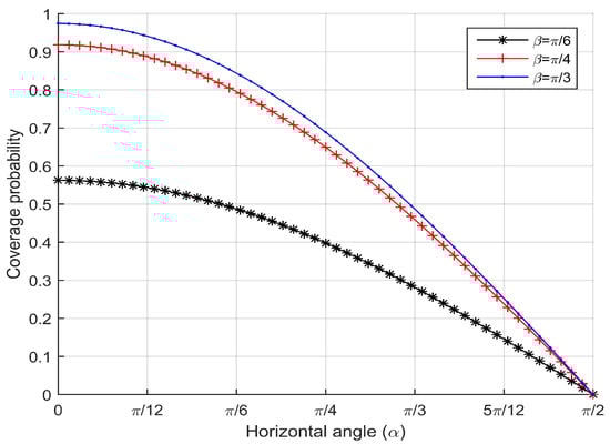 First, we examine the coverage probability p with respect to the effective horizontal angle given the effective vertical angles , and . The horizontal one-half angle of FoV is . The simulation results are shown in Figure 9. We observe that as the horizontal angle becomes larger, the coverage probability p decreases quickly. When the effective horizontal angle is the optimal effective horizontal angle , the coverage probability p becomes the maximum value.