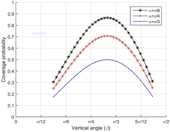 Next, we examine the coverage probability p with respect to the effective vertical angle given the effective horizontal angles , and . We also set the horizontal one-half angle of FoV . The simulation results are shown in Figure 10. As we can see, the coverage probability p does not change monotonically with the effective vertical angle . When the vertical angle is the optimal effective vertical angle , the coverage probability becomes the maximum value.