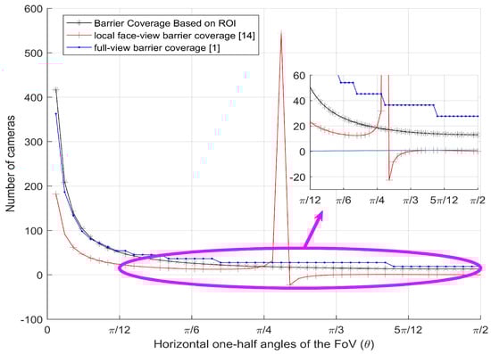 We set the coverage probability 1, and the other parameters with the ones used in local face-view barrier coverage and full-view barrier coverage. As shown in Figure 11, as the horizontal one-half angle of FoV becomes larger, the number of camera sensors required of our barrier coverage and full-view barrier coverage strategies both decrease, but our barrier coverage needs much fewer camera sensors than the full-view barrier coverage. Although the number of camera sensors required of our strategy is a little more than the local face-view barrier coverage when is smaller, the local face-view barrier coverage will be unreasonable for all angles of FoV .