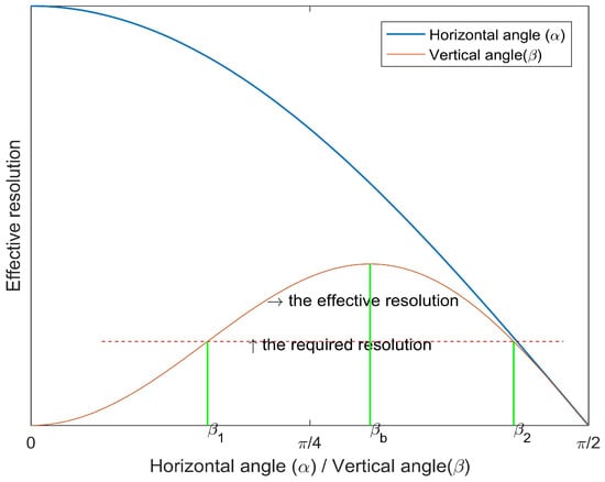 The maximum of the effective resolution can be obtained when the ROI and the camera sensor hold on the optimal effective horizontal angle . As is shown in Figure 5a, .