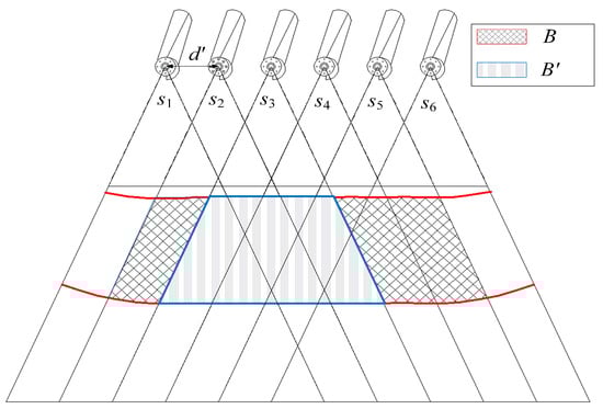 It is important for barrier coverage to capture all the intruders that attempt to cross the barrier region. However, it is a challenge for the barrier to capture and recognize every intruder. From the above analysis, given the camera’s parameters and the monitoring task, we find that the coverage probability is related to the horizontal and vertical angles between the camera sensors and the ROI. In some harsh environmental conditions, the challenge is how to deploy camera sensors to hold with coverage probability even when a camera is damaged (e.g., due to hardware failure). In this worst case scenario, we can refer to the strategy of K-barrier coverage [,] to construct fault tolerance barrier coverage. In our deployment strategy, we should shorten the distance between two adjacent camera sensors to construct K-barrier coverage. As depicted in Figure 13, to enhance the fault tolerance of the camera sensor networks, the distance between two adjacent camera sensors satisfies , and a set of camera sensors are deployed to form two-barrier coverage B. Thus, once an intruder attempts to cross the barrier region, at least two cameras will capture him. For example, if the camera sensor malfunctions, the monitoring area is also be captured by other cameras and guarantees the coverage probability.
