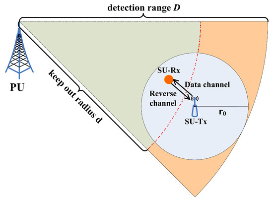 Even if the distance between the SU-Tx and PU is larger than d, the coverage area of the SU-Tx, i.e., the gray circle in Figure 1, may still overlap with the keep-out region. To avoid potential collisions with PU, the SU-Tx is usually required to detect PU signals within a much larger radius D in the context of non-cooperative sensing [24]. Alternatively, the SU-Tx in PaCoSIF collects the sensing results of the current SU-Rx via the reverse channel provided by full-duplex radio and then fuses them with local decisions to relax the sensitivity requirement on either sensor.