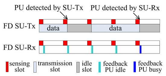Current research on full-duplex sensing mainly focuses upon the impact of RSI on sensing performance as well as spectrum efficiency in the case of a single sensor [9,10,11,12,13,14,15,16] or multiple cooperative sensors [17]. It has been widely assumed that SUs are deployed in spectrum-homogeneous environments. However, recent on-site surveys reveal that spectrum heterogeneity is not unusual in practical scenarios [18]. In heterogeneous environments, SUs may have different views on spectrum activity, expressed as different signal-to-interference-and-noise-ratio (SINR) regimes [19,20]. Therefore, it is no longer safe for an SU transmitter (SU-Tx) to access the spectrum according to its own observation. Instead, an SU-Tx should cooperate with its receiver (SU-Rx) to make a link-level decision via data fusion [21].