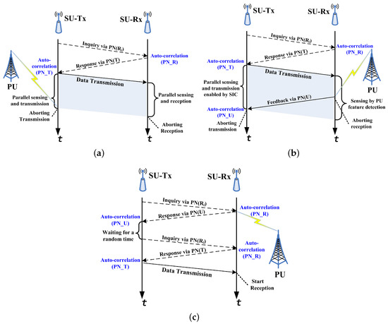 Flowcharts of the PaCoSIF. Three typical scenarios are represented: (a) PU’s return is detected by the SU-Tx; (b) PU’s return is detected by the SU-Tx; (c) multiple handshakes due to spectrum heterogeneity.