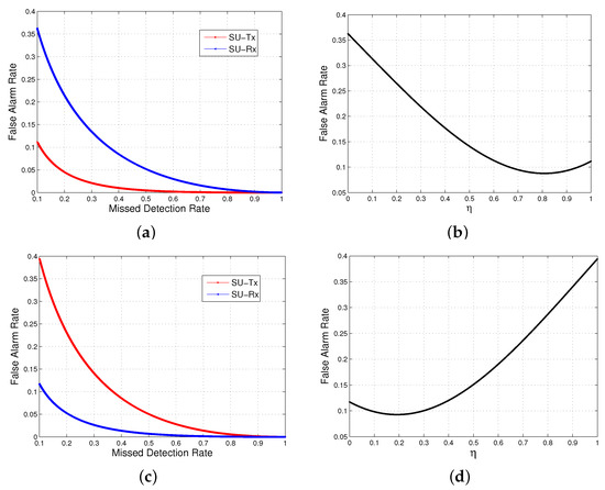 The sensing results of the SU-Tx and the SU-Rx are fused using the OR rule. Let and represent the missed detection rate and the false alarm rate of the fused decision, respectively. They can be represented as follows: