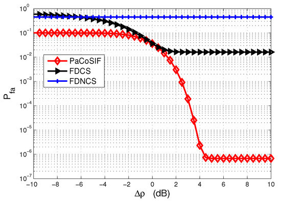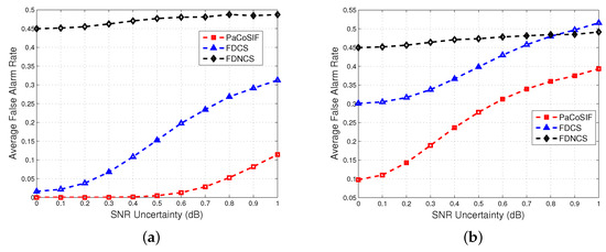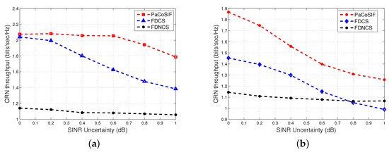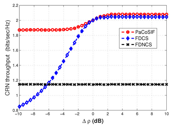The difference between the changing rate of CRN throughput in Figure 11 and that of the false alarm rate in Figure 5 is worth noting. When grows from 0 dB to 10 dB, the false alarm rate of PaCoSIF drops by four orders lower than that of FDCS, but the absolute value of the decrease in is actually small. Therefore, the throughput enhancement of PaCoSIF against FDCS in this scenario is not that significant. On the contrary, when is reduced from 0 dB to −10 dB, the false alarm rate of PaCoSIF is only four times lower than that of FDCS, but the absolute value of the increase in is large. Therefore, the throughput enhancement of PaCoSIF against FDCS in this extreme scenario is significant.