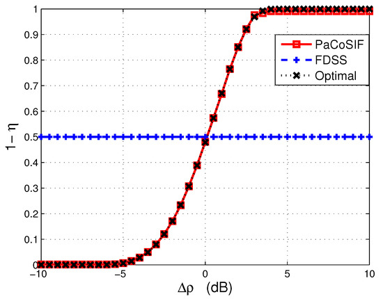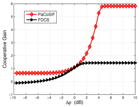 When the SINR of SU-Rx is high, its detector outperforms that of the SU-Tx, and, therefore, the feedback from the SU-Rx would drastically improve the link-level sensing performance. In such a case, PaCoSIF tries to make full use of the feedback from the SU-Rx by assigning a small missed detection rate to the SU-Rx. For example, when , the missed detection rate of the SU-Rx is , and the exponent assigned to the SU-Rx is , as shown in Figure 7. However, the false alarm rate of the SU-Rx is still low owing to its high SINR. Meanwhile, the exponent assigned to the SU-Tx is , and a low false alarm rate is obtained since its missed detection rate, , has been relaxed to be sufficiently large. On the contrary, the missed detection rates of the two sensors in FDCS are relaxed with the same exponent 0.5. As a result, the cooperative gain of PaCoSIF is four orders higher than that of the FDCS.