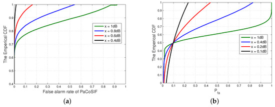 Figure 8 shows the distributions of when is 4 dB and –4 dB. Without SINR uncertainty, i.e., , the optimal false alarm rates are and 0.098, respectively. For each , the noise uncertainty x varies between 0 dB and 1 dB. As the SINR uncertainty increases, the distribution range of enlarges significantly. For example, when noise uncertainty is , the largest will approach 1. SINR estimation error degrades the performance of PaCoSIF in two ways. Firstly, the detection threshold of an individual sensor becomes inaccurate. Secondly, the assigned exponent becomes sub-optimal.