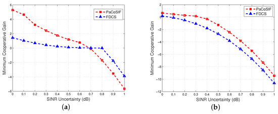 Now, we investigate the worst and average sensing performance of PaCoSIF as the SINR uncertainty increases. Figure 9 shows the relationship between the minimum cooperative gain and the SINR uncertainty when is 4 dB and −4 dB, respectively. The minimum cooperative gains of both PaCoSIF and FDCS decrease drastically as SINR uncertainty enlarges. In the worst case, the cooperative gain of PaCoSIF may be even smaller than that of FDCS since SINR error misleads the optimization process of PaCoSIF.